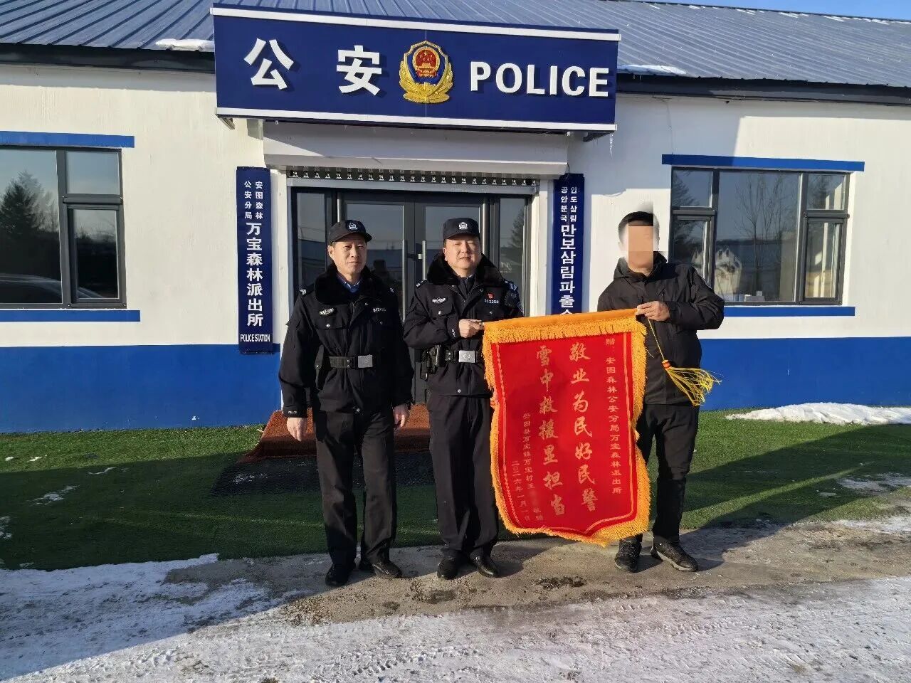 元旦节当天,居民王先生专程来到省公安厅森林公安局安图森林公安分局万宝森林派出所,赠送了一面印有“雪中救援显担当 敬业为民好民警”的锦旗,感谢民警不畏严寒在风雪中帮助其脱险。