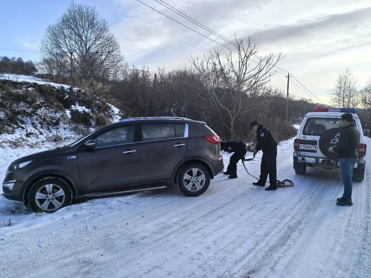 据悉,12月26日傍晚,安图林区普降大雪,雪天路滑极易发生交通事故,万宝森林派出所立即启动恶劣天气应急预案,全员上路开展路面巡查、交通疏导、暖心救助等工作。民警巡逻至古洞河附近路段时,发现一辆棕色越野车侧滑至路边水沟内。该路段过往车流量较大,且路面坡度陡,民警立即上前查看得知,由于路面较滑,车主王先生驾驶的车辆不慎驶入路边水沟,无法自行脱困,所幸其本人并无大碍。民警立即在该车附近放置反光锥桶、三角牌等警示标志,提醒过往车辆注意避让,同时通过警车及救援工具成功将被困车辆摆脱险境。“不是你们及时帮助,我真不知道该怎么办了,太感谢你们了!”王先生连声道谢……