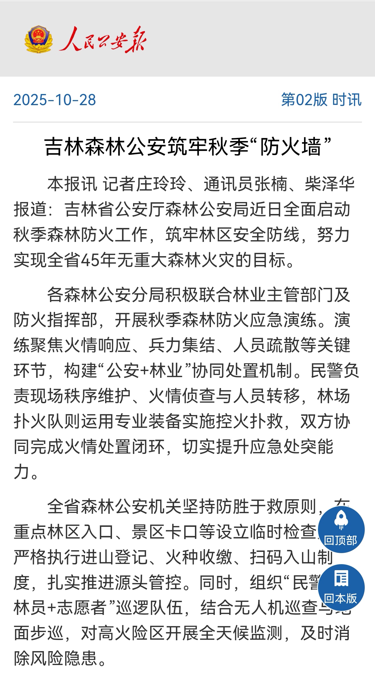 媒体聚焦|《人民公安报》:吉林森林公安筑牢秋季“防火墙”