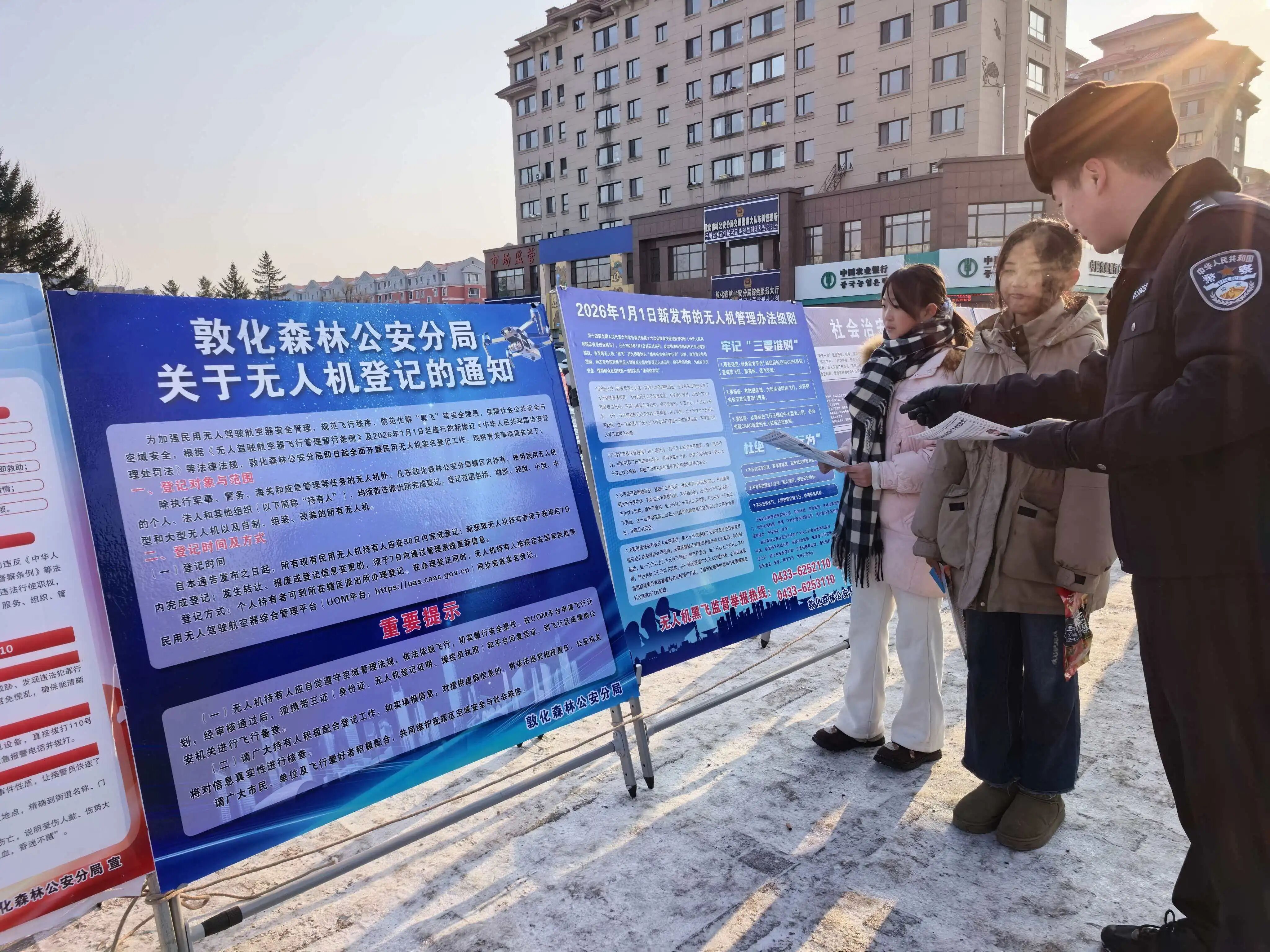 多维宣传,凝聚护空合力。各森林公安分局立足林区实际,开展宣传工作:临江、桦甸森林公安分局利用无人机搭载喊话器巡逻播报相关法规;和龙、汪清森林公安分局聚焦老里克、雪岭、东北虎豹国家公园等景区开展靶向宣传;敦化、珲春、蛟河森林公安分局通过入户讲解、发放传单、微信推送等形式普及法规;抚松、江源、安图森林公安分局深入企业、林场沟系等重点生态区域分层次开展宣传,详细解读《治安管理处罚法》有关内容,结合“黑飞”典型案例阐明法律后果,帮群众理清飞行边界,引导群众自觉守法,形成共同维护空域安全的良好氛围。