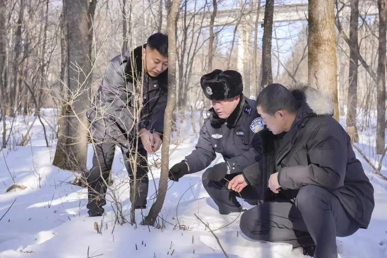 行动前夕,森林案件侦查大队会同森林资源管理处、自然保护地管理中心等相关单位,立足和龙林区地形特点及以往案例,精准制定“网格化排查、全链条整治”的实施方案,明确责任分工,确保行动高效有序推进。行动期间,联合行动组深入林区偏远沟系、林缘交界地带、野生动物栖息地等开展“拉网式”清山清套清网排查,对树根、灌木丛、沟壑等隐蔽部位进行细致搜查,重点清除非法猎套、猎夹、猎网等捕猎工具,做到“巡过一地、清理一地、安全一地”,有效消除了安全隐患。与此同时,联合行动组深入辖区同步推进野生动植物保护普法宣传工作,民警通过悬挂宣传条幅、发放宣传手册、现场答疑解惑等形式,向林区职工群众普及《中华人民共和国野生动物保护法》《中华人民共和国野生植物保护条例》等相关法律法规,结合典型案例详细讲解非法猎捕、交易野生动物、盗伐林木及私设捕猎工具的法律后果与生态危害,并公布违法线索举报方式,鼓励群众主动参与到生态保护工作中来,积极营造“全民保护、共建共治”的良好氛围。